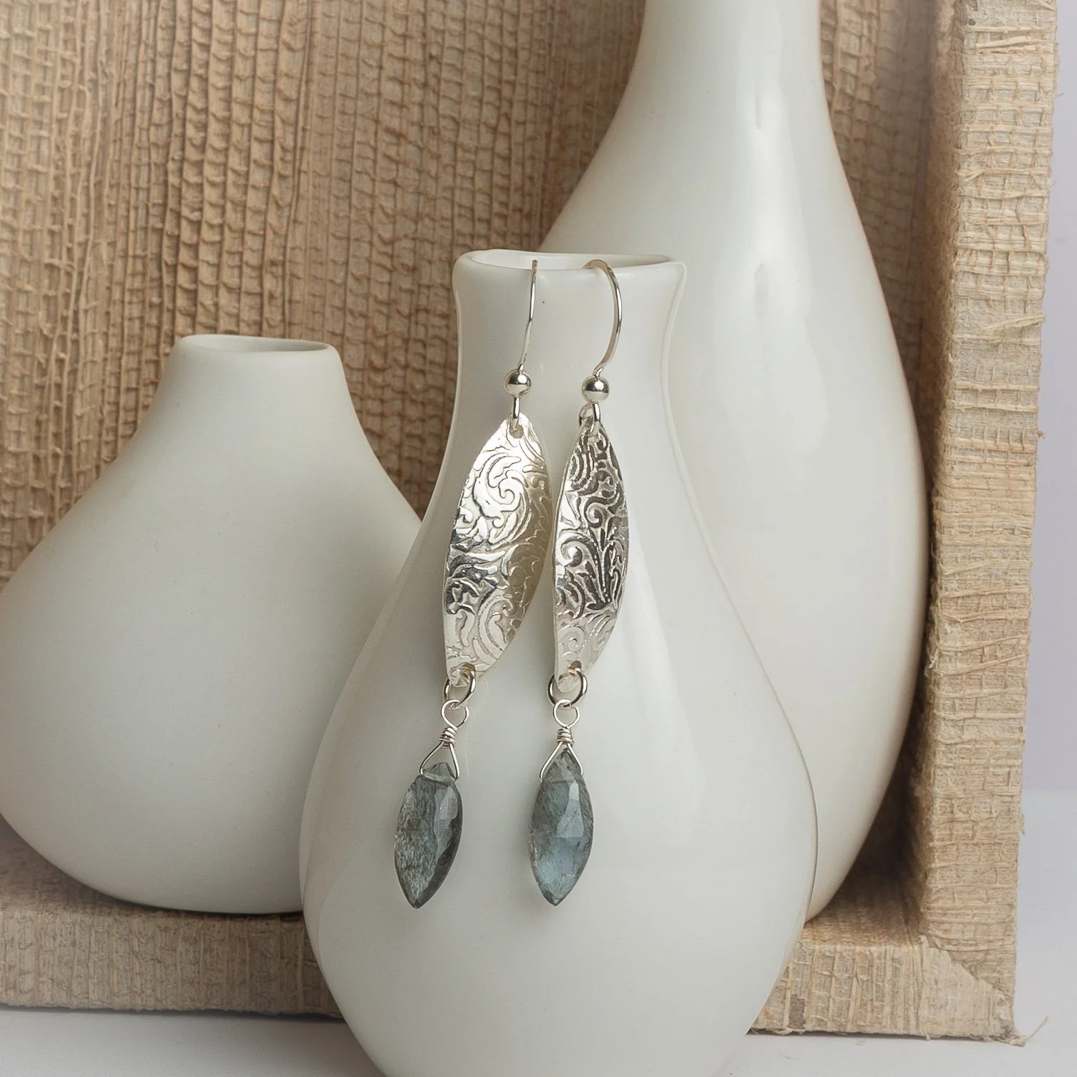 Design: Long French Hook Drop, Teardrop-Shaped Silver Dangle, Stamped Floral Motif